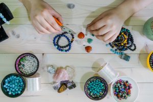High,Angle,View,Of,Young,Woman,Making,Crystal,Jewelery,Necklace